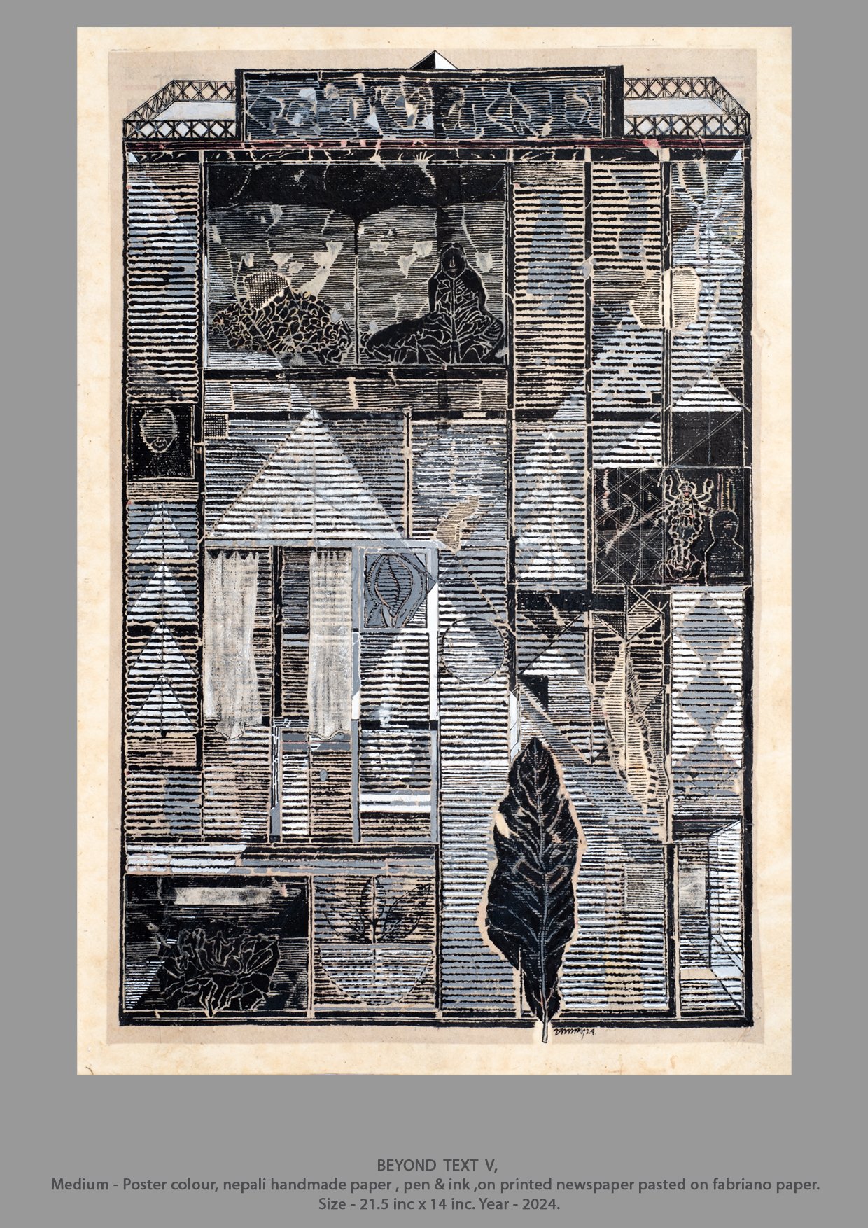 Medium : Poster Colour, Pen & Ink, Nepali Handmade paper on printed newspaper pasted on Fabriano paper